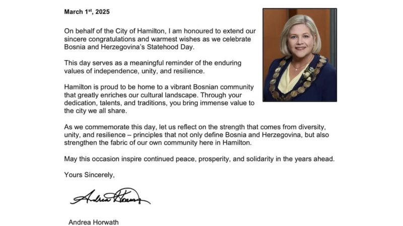 Postovani gradani Bosne i Hercegovine u Kanadi, Na ovaj dan prije 33. godine na referendumu smo se opredijelili za suverenu, medunarodno priznatu, cjelovitu drzavu ravnopravnih naroda i gradana koji u njoj zive. Danas je prilika da se podsjetimo na vrijednosti ovog datuma i na nasu obavezu da ucimo buduce mlade generacije koje dolaze kako nasu … Nastavi čitati Cestitka gradonacelnice Hamiltona povodom Dana nezavisnosti