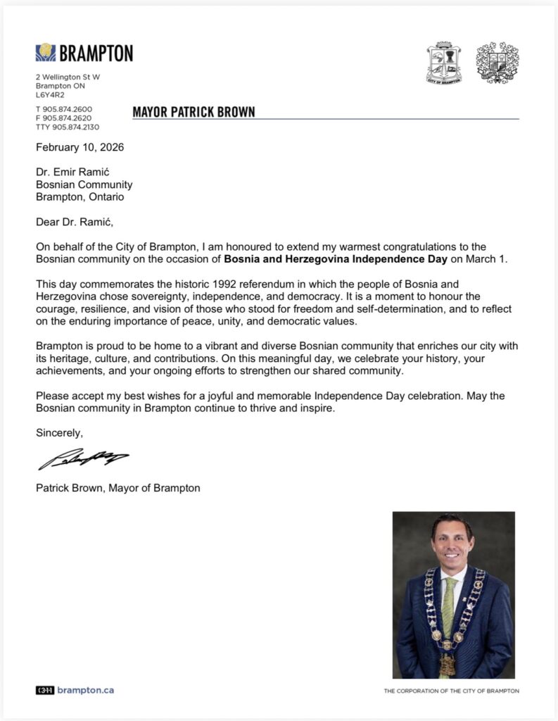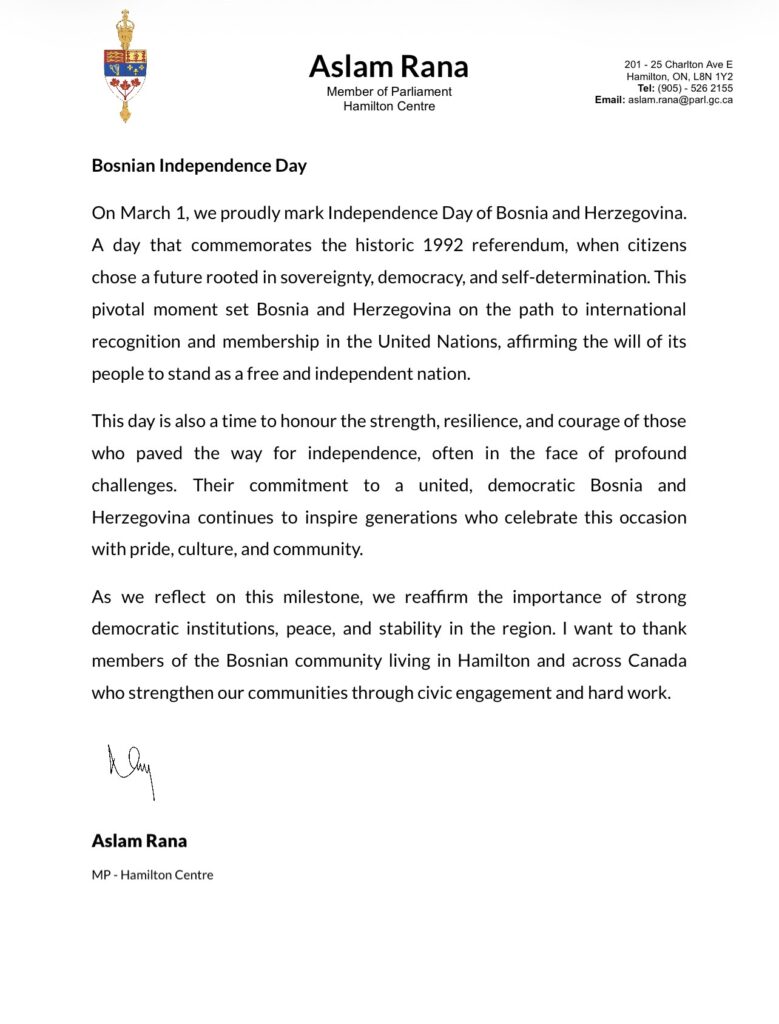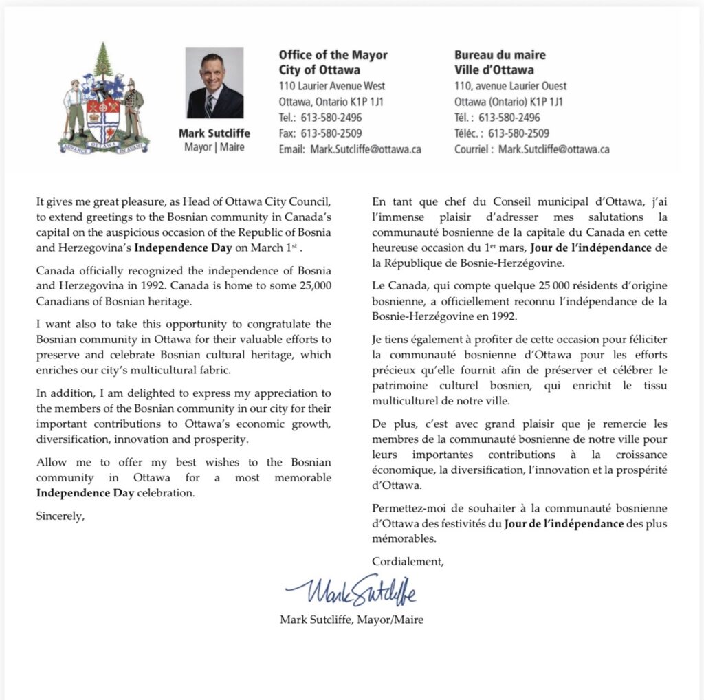 Ove godine povodom Dana nezavisnosti BiH rekordan broj kanadskih političkih lidera, članova Vlade i Parlamenta Kanade, premijeri kanadskih pokrajina i teritorija i gradonačelnici kanadskih gradova su odali počast državi BiH, čestitali joj jedan od največih blagdana, Dan nezavisnosti i odali priznanje bosanskohercegovačkoj dijaspori za njenu kontinuiranu borbu za očuvanje i jačanje bosanskohercegovačkih interesa u Kanadi, njene bogate historije, kulture i tradicije.