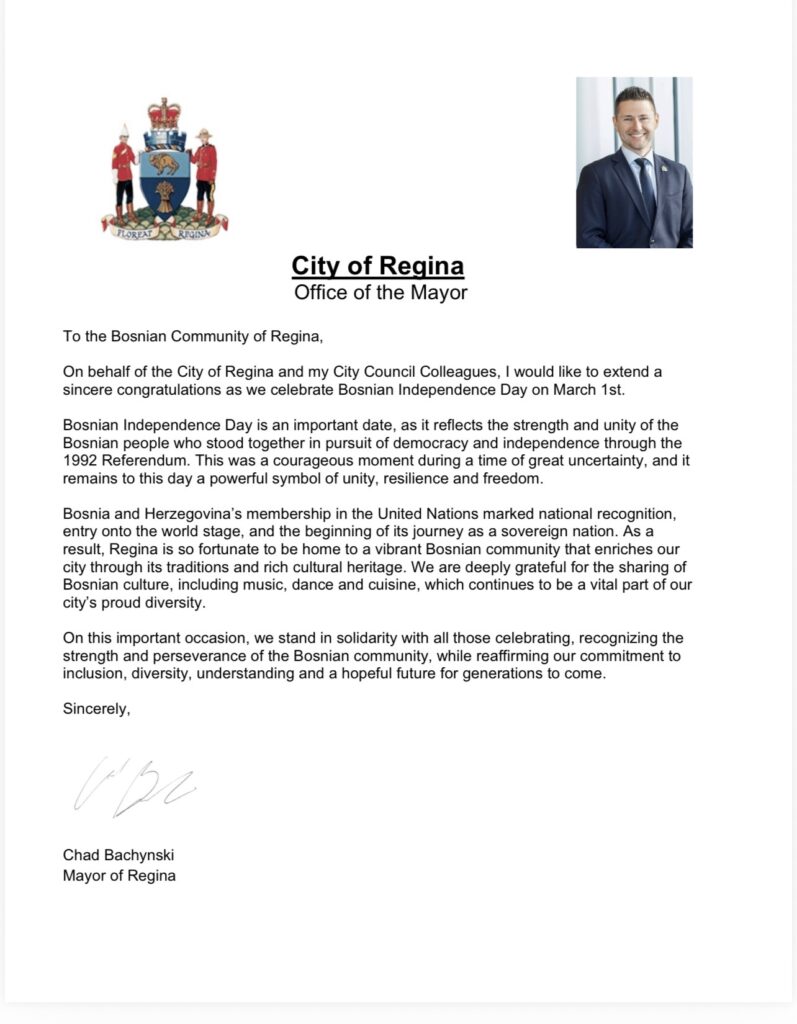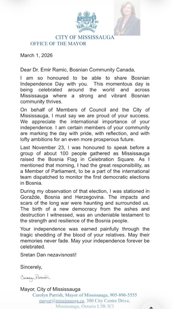 Zato smo  ponosni na svoju domovinu. Zato je čuvamo i jačamo u Kanadi. Svim građanima i građankama BiH ma gdje bili ;estitamo 1. mart, Dan nezavisnosti jedine nam naše domovine BiH.