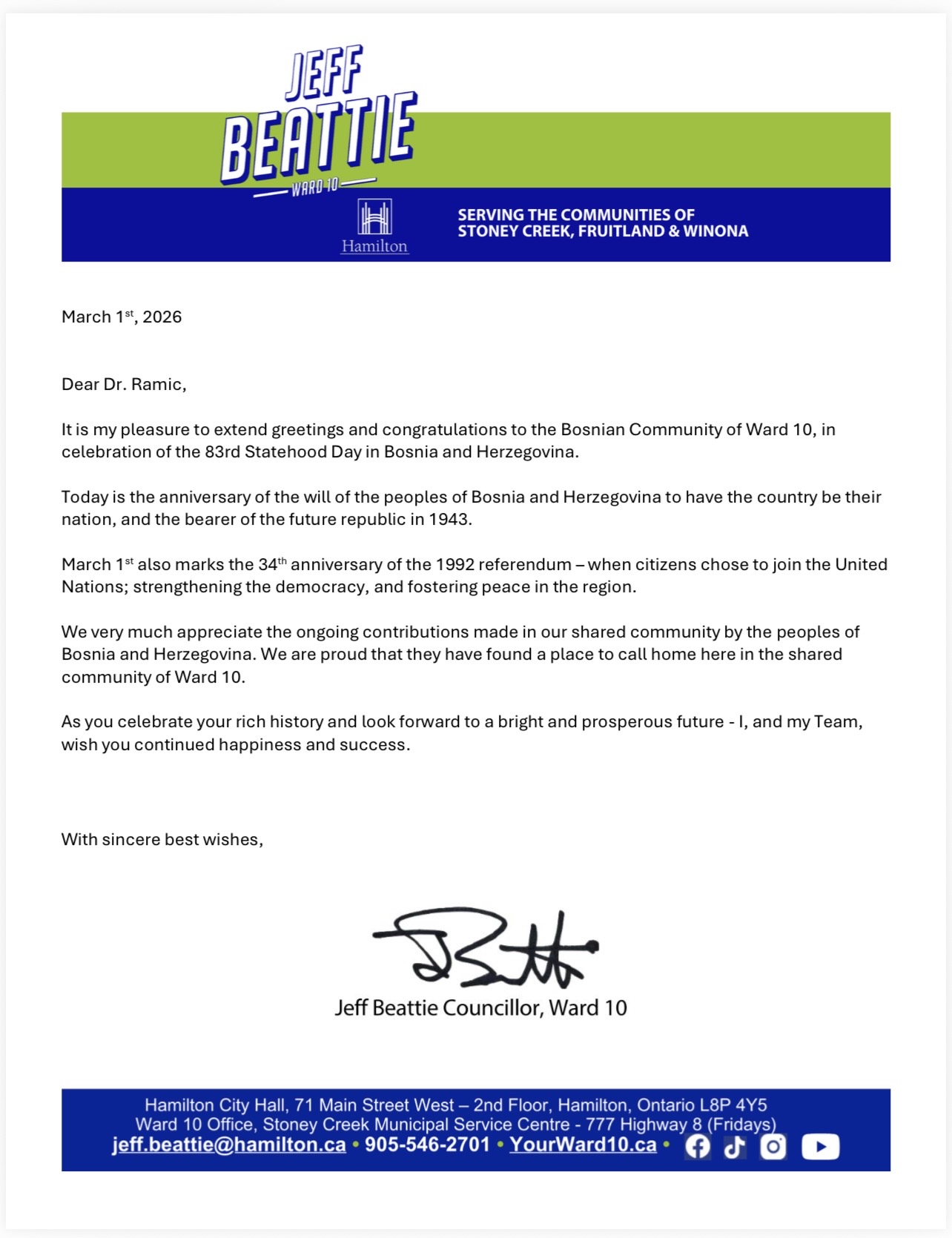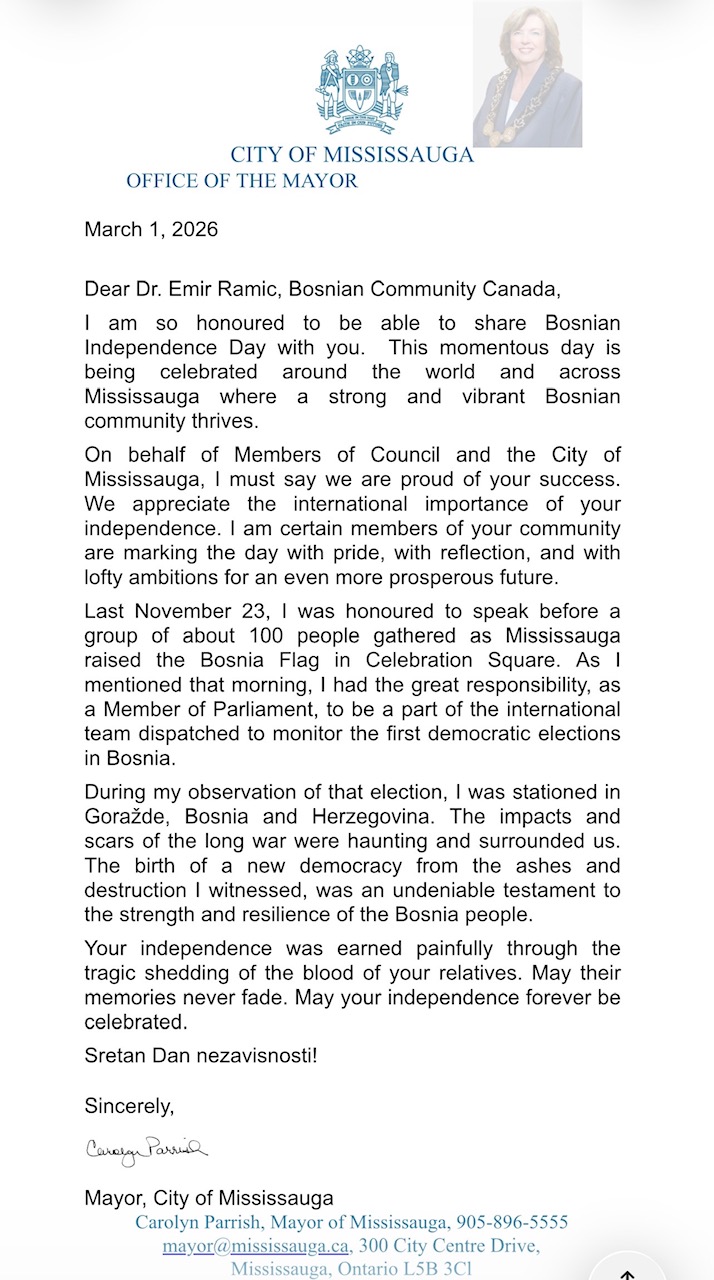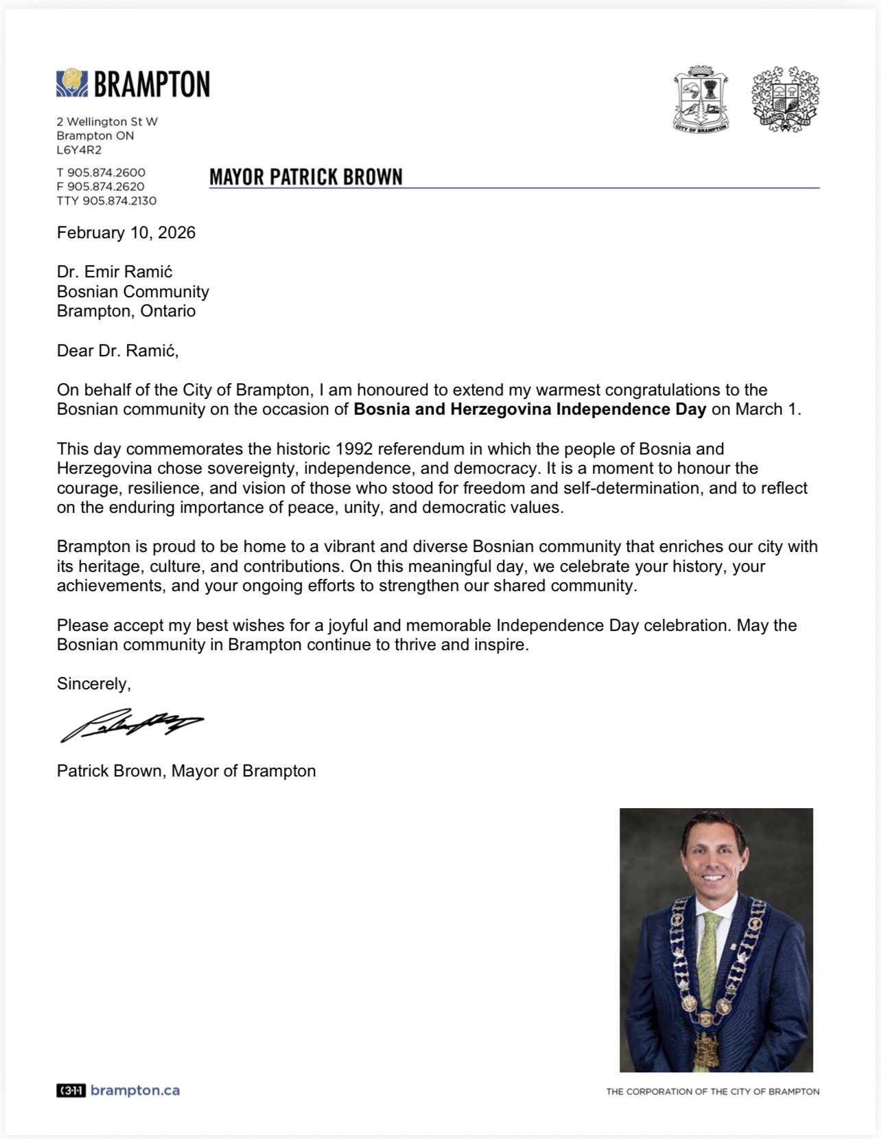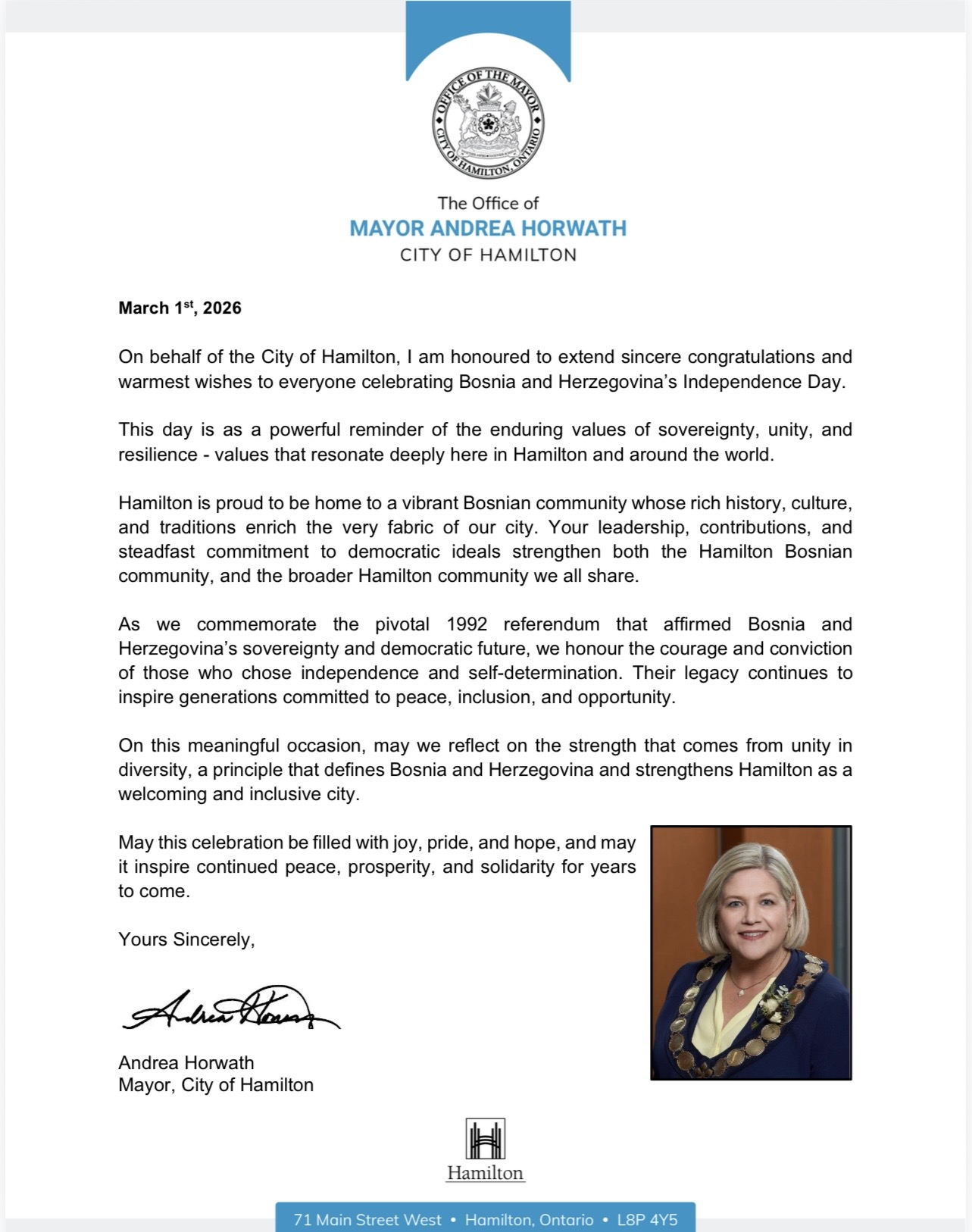 Zato smo  ponosni na svoju domovinu. Zato je čuvamo i jačamo u Kanadi. Svim građanima i građankama BiH ma gdje bili ;estitamo 1. mart, Dan nezavisnosti jedine nam naše domovine BiH.