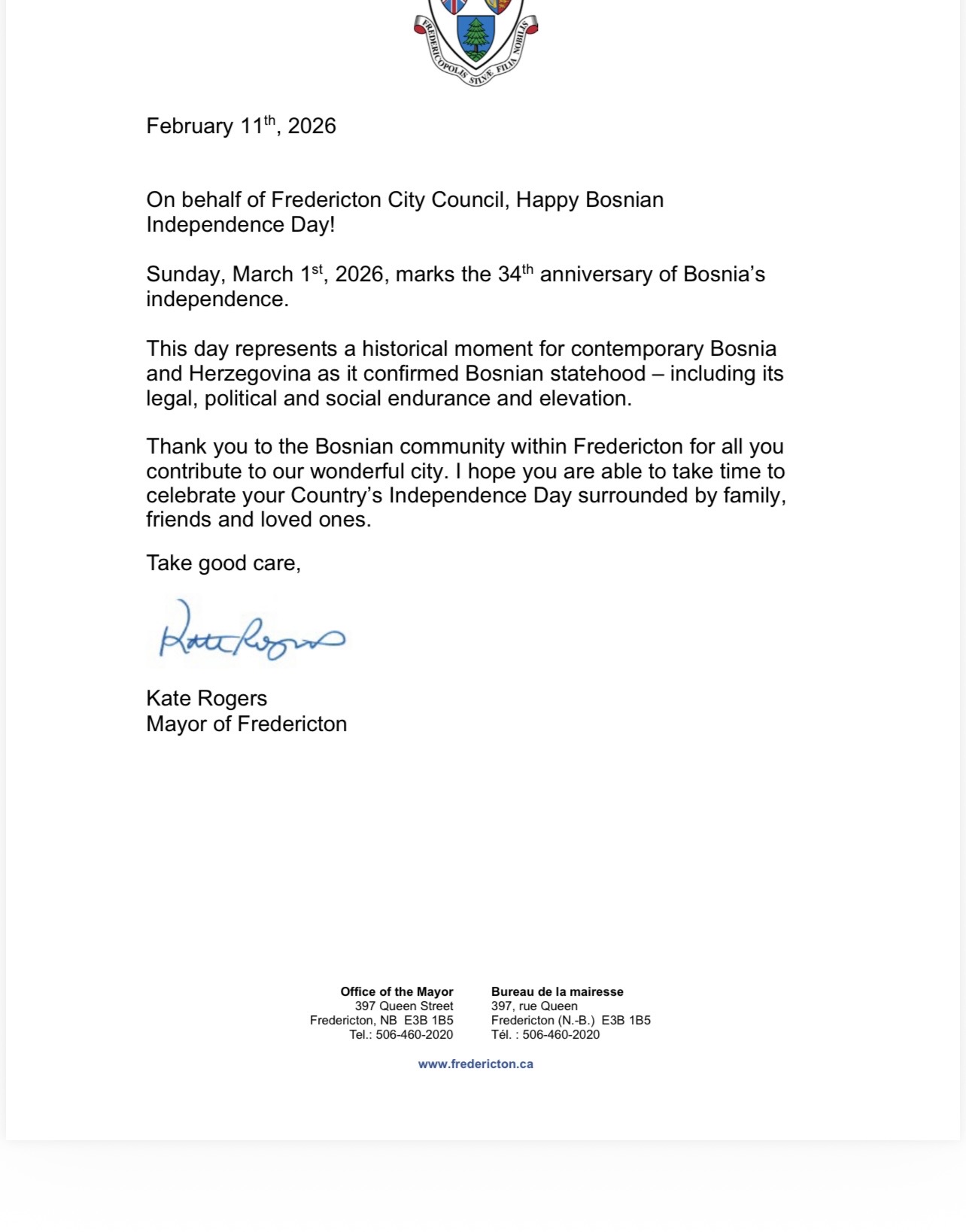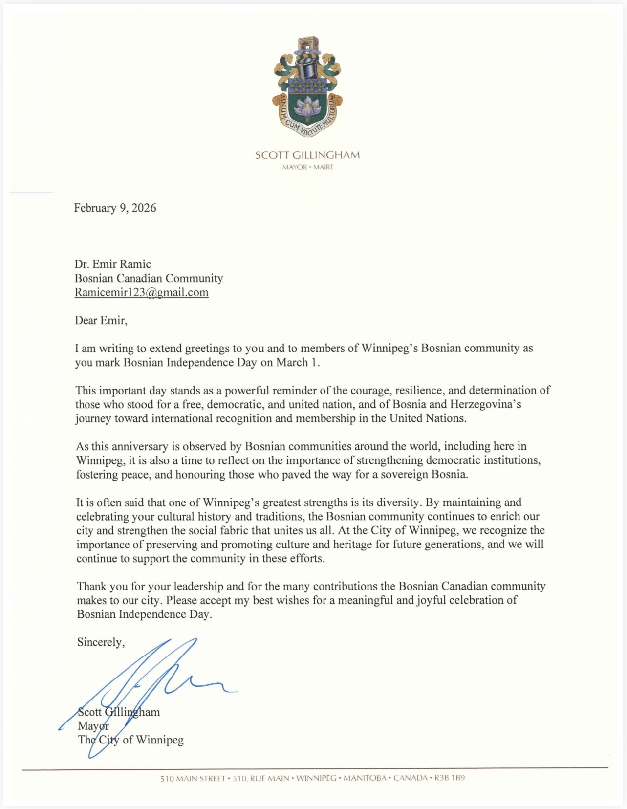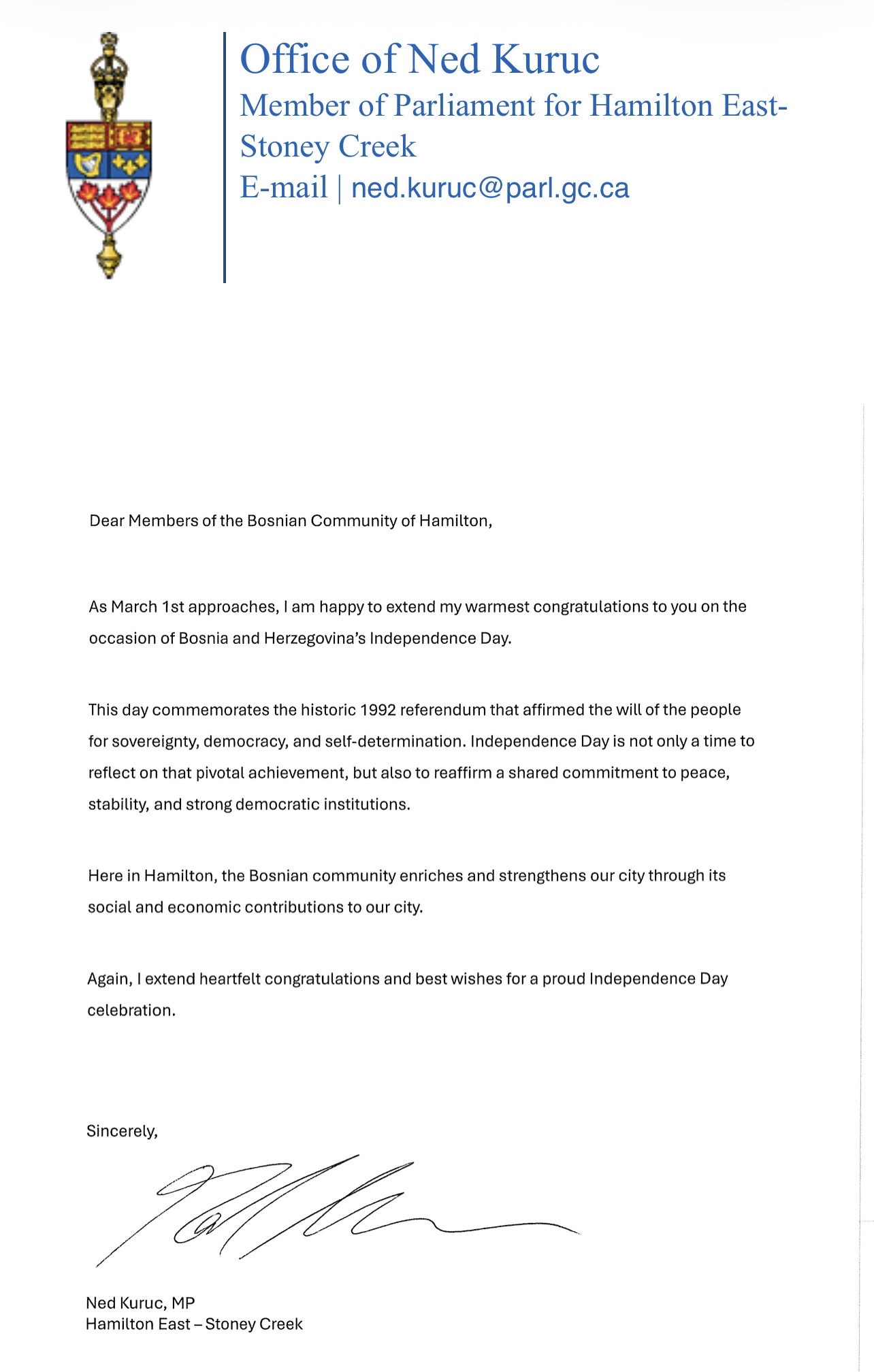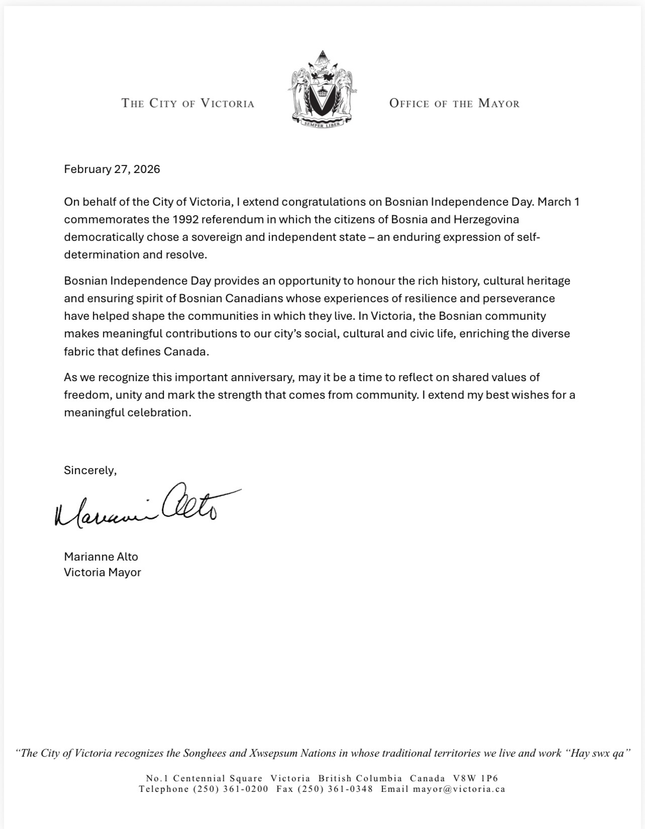 Zato smo  ponosni na svoju domovinu. Zato je čuvamo i jačamo u Kanadi. Svim građanima i građankama BiH ma gdje bili ;estitamo 1. mart, Dan nezavisnosti jedine nam naše domovine BiH.